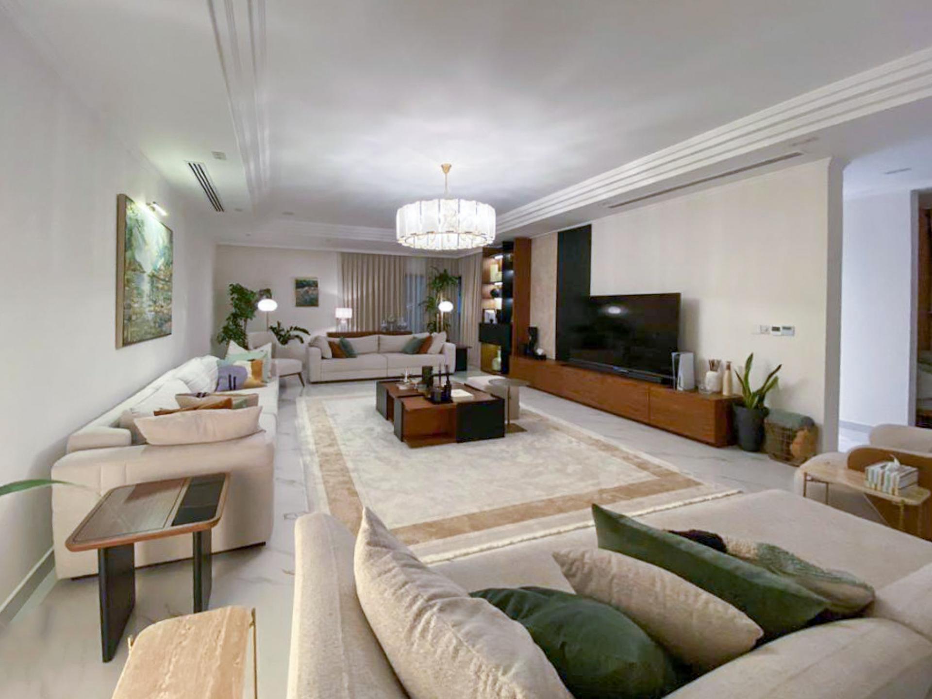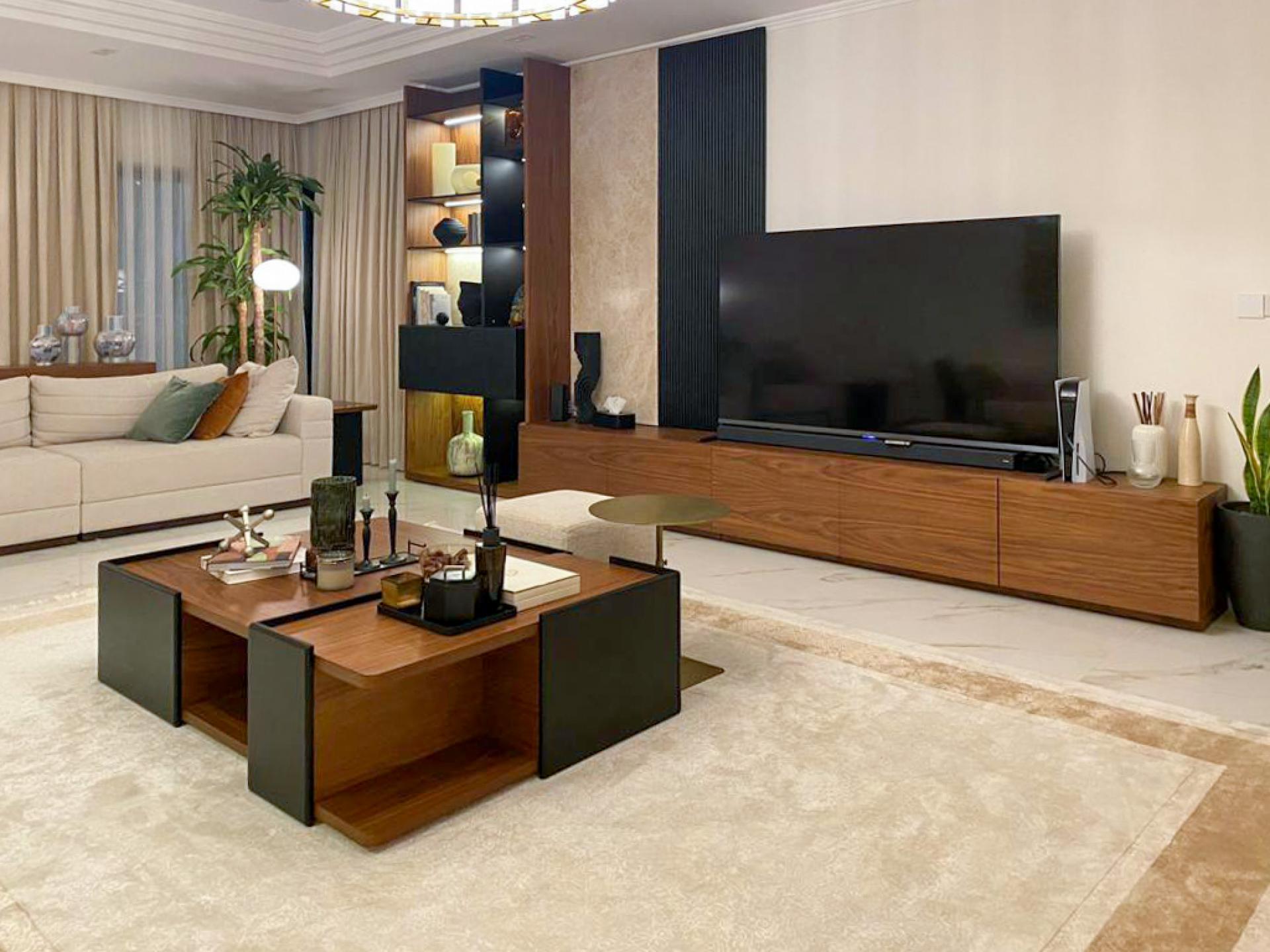 Tasarım sürecinde doğal ahşap dokularını, sezonun öne çıkan renkleri olan krem ve yeşil tonlarıyla birleştirerek sıcak ve ferah bir atmosfer oluşturduk. Modern çizgilere sahip geniş oturma grupları, minimal orta sehpalar ve özel üretim TV ünitesi, mekanın ihtişamını desteklerken kullanım kolaylığı da sağladı.