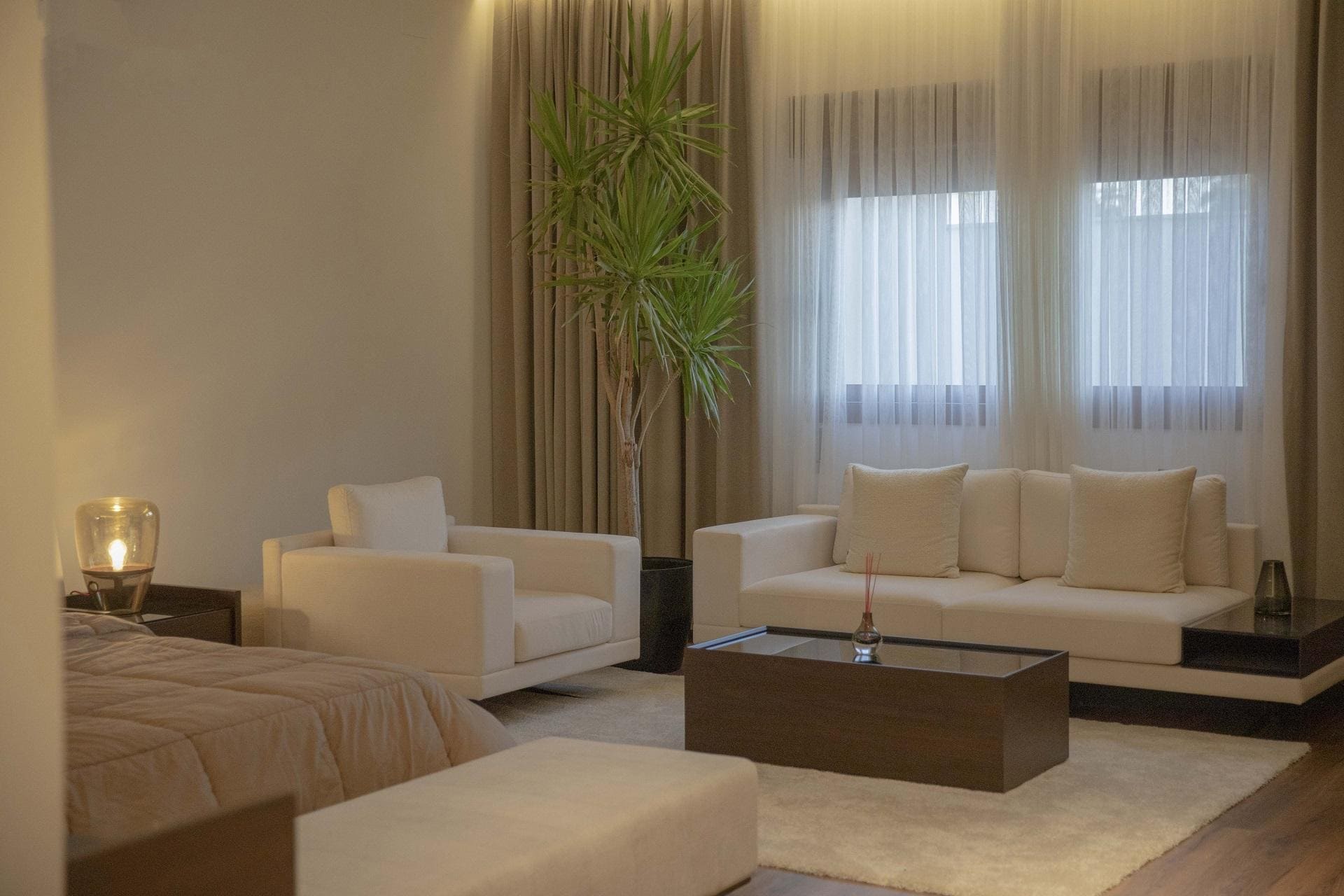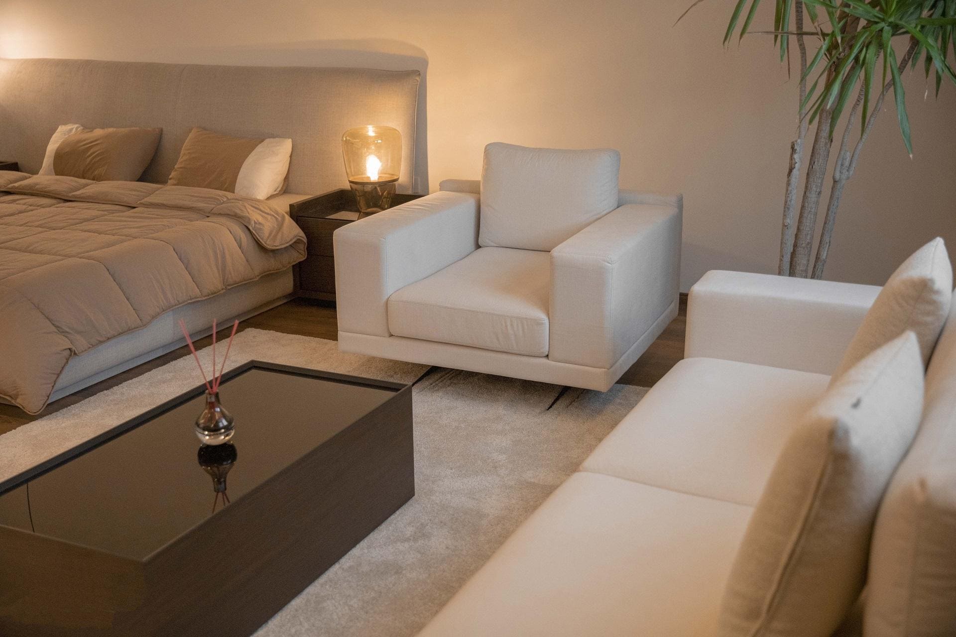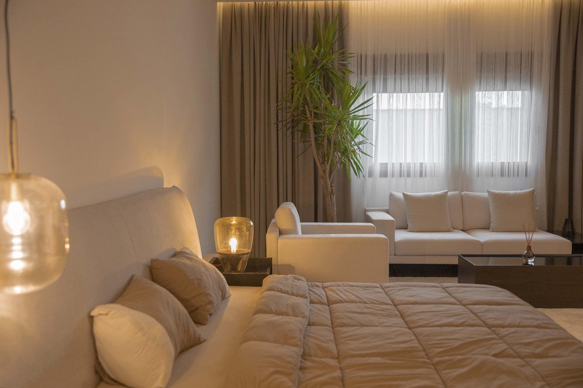 Proje kapsamında tasarlanan ebeveyn yatak odası, soft renklerin hakim olduğu, modern ve minimal bir dekorasyon anlayışıyla şekillendirilmiştir. Ergonomi ve konfor öncelikli bir şekilde tasarlanan bu alanda, oturma köşesi birinci sınıf malzemelerle özel ölçülerde üretilmiştir.