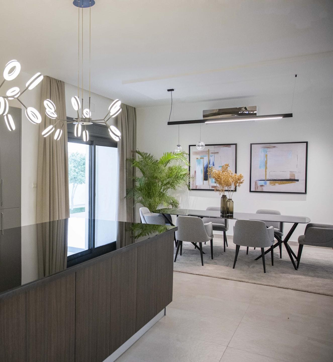 Giriş ve yemek odası alanında, müşterilerimizin beklentilerine uygun olarak tasarlanan kahve köşesi, yüksek konfora sahip berjerlerle desteklenmiştir. Kahve alanının karşısında konumlandırılan yemek odası, kaliteli malzemelerle üretilmiş yemek masası ve sandalye takımlarıyla tamamlanmış; böylece işlevsellik ve estetik bir araya getirilmiştir.