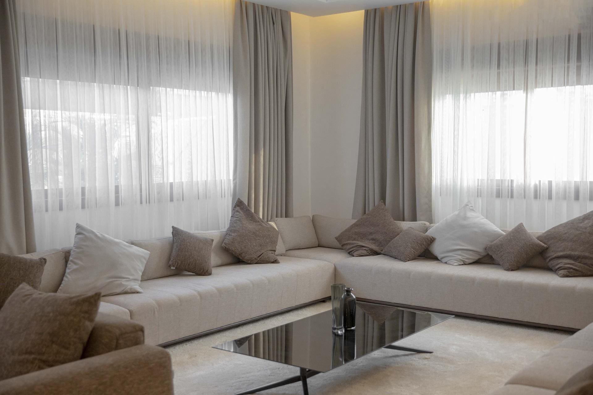 Salonda tercih edilen köşe koltuk modeli, hem mekanın daha pratik ve işlevsel kullanılmasını hem de alanın daha geniş görünmesini sağlamaktadır. Ahşap TV ünitesi ise dekorasyonu tamamlarken, cam modüllerle salona derinlik katılmış ve şık bir görünüm elde edilmiştir. Bu tasarım sayesinde salon, ferahlık ve detayların uyumlu bir şekilde sergilendiği bir yaşam alanına dönüşmüştür.