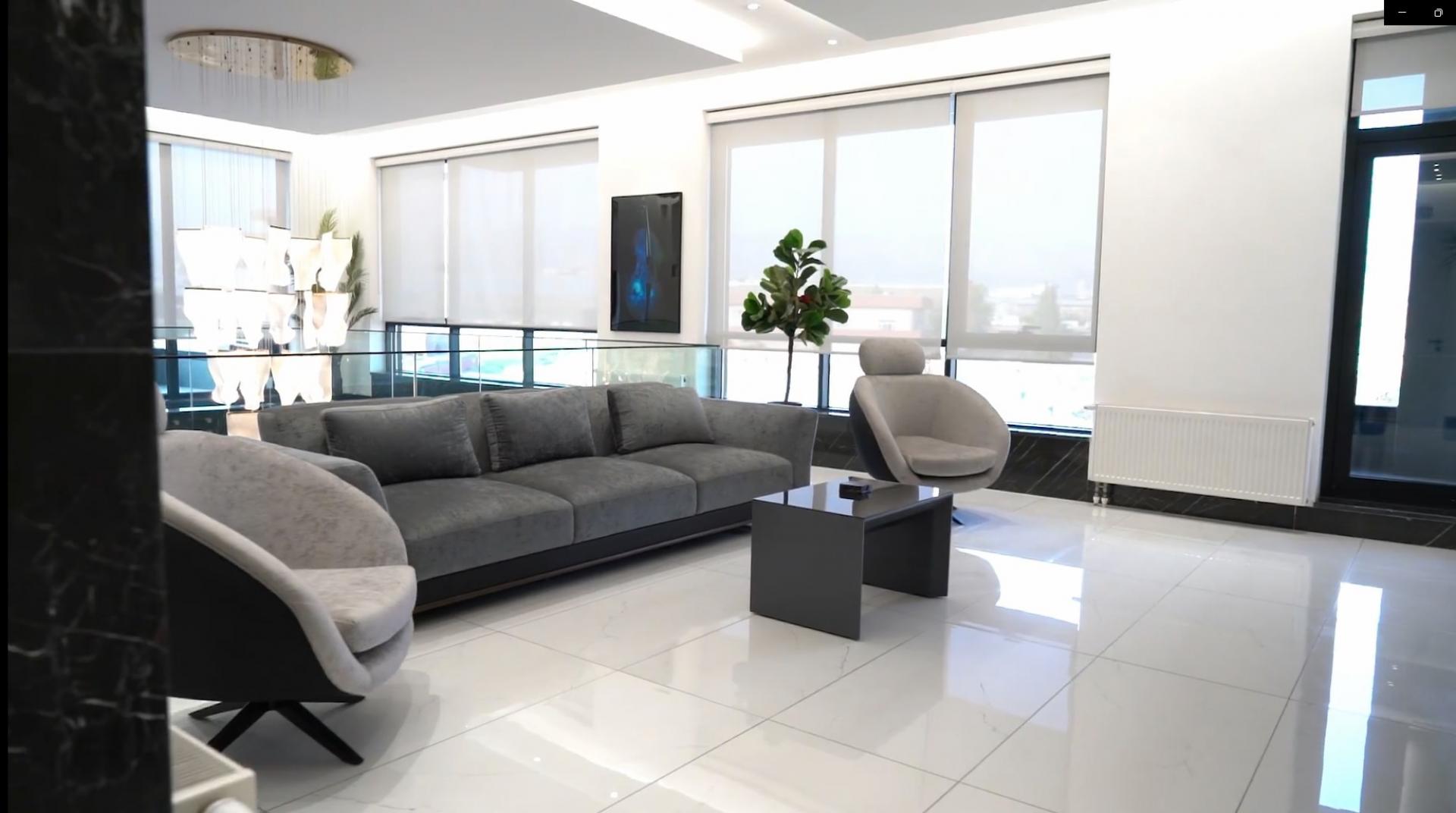 Geniş salon alanında seçtiğimiz modern çizgilere sahip koltuk takımları, nötr tonlarla salonun ferahlığını artırırken, siyah detaylar mekâna asil bir karakter kazandırdı. Mermer detaylı sehpa ve modern aydınlatmalarla tamamlanan salon dekorasyonu, evin genel havasına sofistike bir dokunuş kattı.