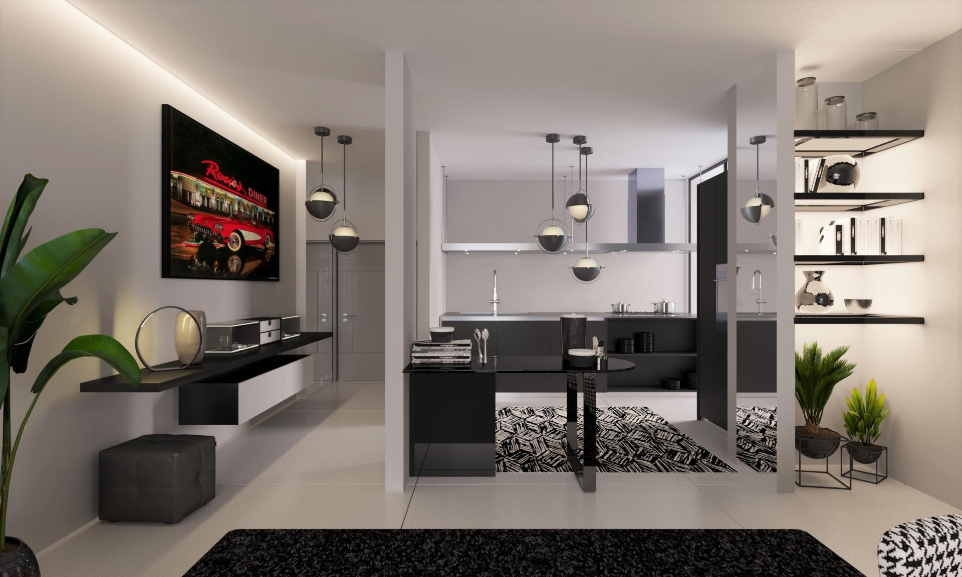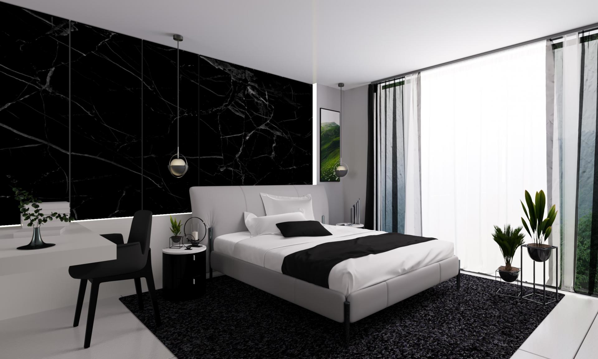 Çağdaş tasarım anlayışı ile şekillenen bu modern ev dekorasyonu, siyah ve beyazın güçlü kontrastını zarif detaylarla buluşturuyor. Fonksiyonel alan kullanımı, açık plan mutfak ve salon bütünlüğü ile desteklenirken, geniş cam yüzeyler doğal ışığı maksimum düzeyde iç mekana taşıyor. Minimalist çizgilerin hakim olduğu mobilya seçimi, konforu ve estetiği bir arada sunuyor. Modern sanat eserleri, şık aydınlatmalar ve bitki detaylarıyla zenginleşen atmosfer, evde dinamik ve sofistike bir yaşam alanı oluşturuyor.
