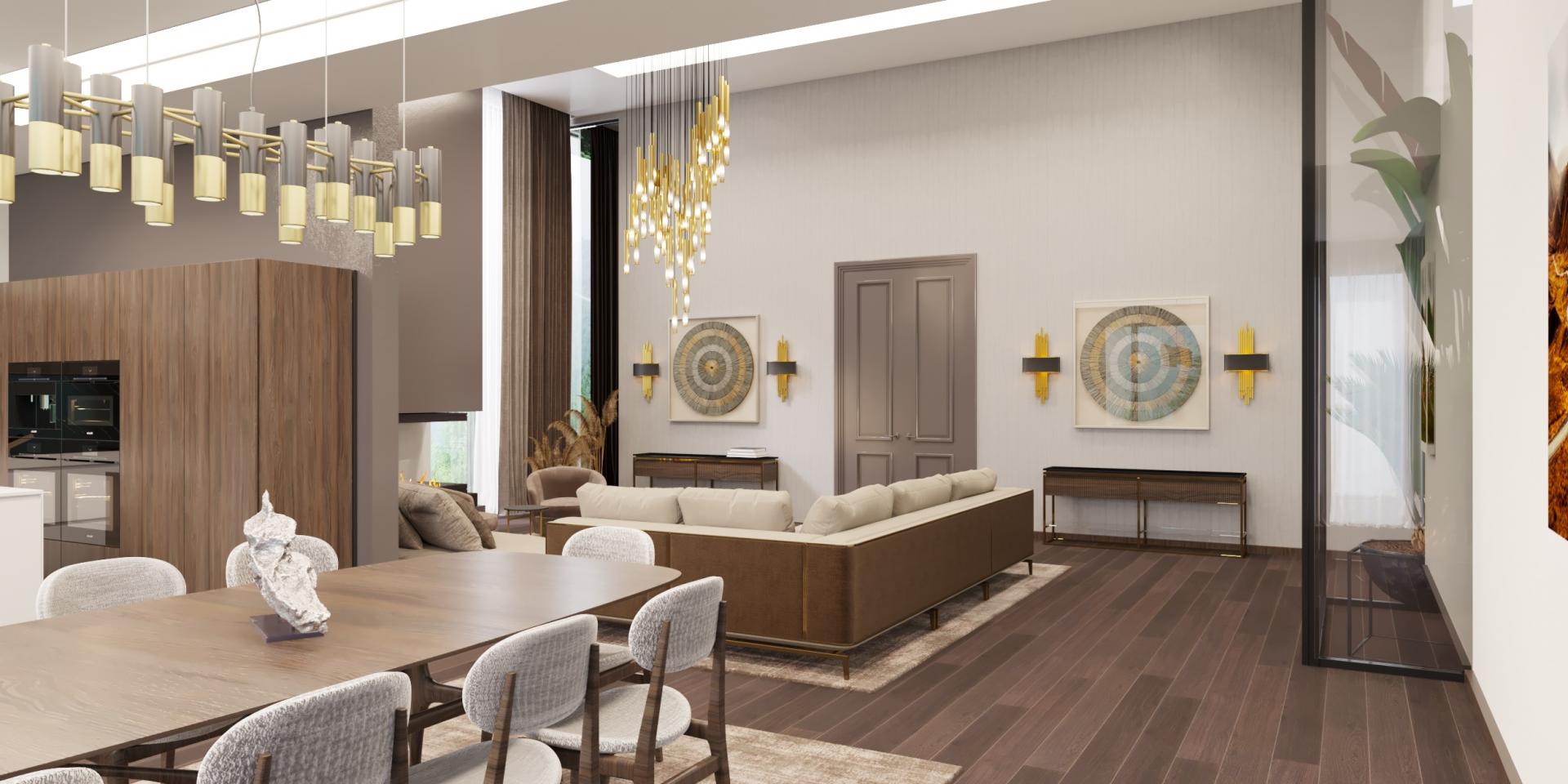 Modern çizgilerle sıcak bir atmosferin buluştuğu bu tasarımda, açık renk tonlarındaki koltuklar ve doğal ahşap dokular öne çıkıyor. Yüksek tavanlar, geniş cam cephelerle birleşerek ferah bir yaşam alanı sunuyor. Altın detaylı aydınlatmalar ve zarif sanat eserleri, salonun şıklığını tamamlıyor. Libya projemizde zamansız bir zarafet anlayışını yeniden yorumladık.