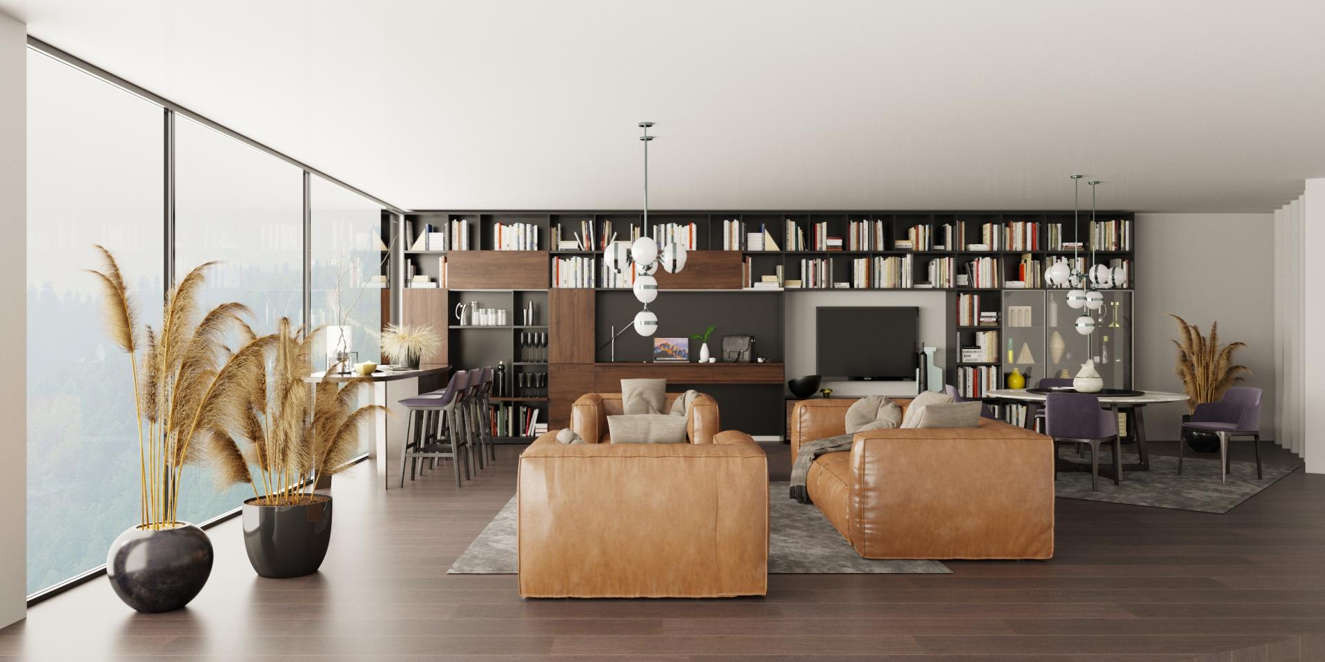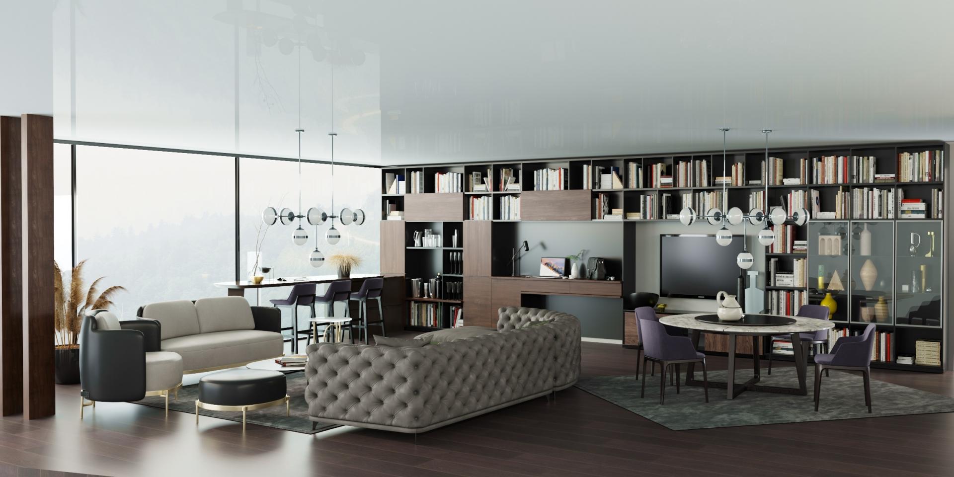 Projede kullanılan mobilyalar, minimalist çizgileri ve çağdaş tasarım anlayışıyla dikkat çekiyor. Özenle seçilen oturma grupları ve kitaplık sistemleri, alanın hem fonksiyonel hem de estetik olmasını sağlıyor. Kahverengi deri koltuklar ve gri tonlarının uyumu, sıcak bir atmosfer yaratırken, geniş pencere tasarımıyla doğal ışık mekana ferahlık katıyor.