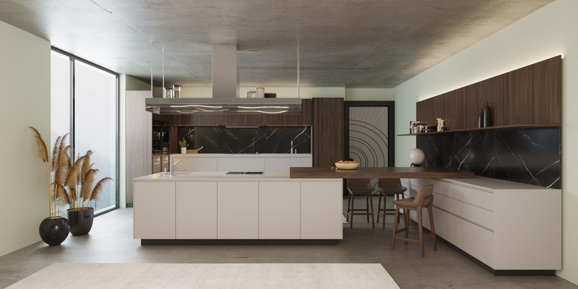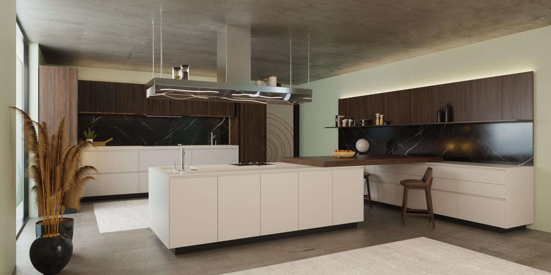 Projede yer alan mutfak bölümü, modern hatları ve ahşap detaylarıyla dikkat çekiyor. Siyah mermer backsplash ve aydınlatma unsurları, mutfağı sofistike bir seviyeye taşıyor. Ada mutfak tasarımı, yemek hazırlama ve sosyal alan olarak işlevselliği ön plana çıkarıyor.