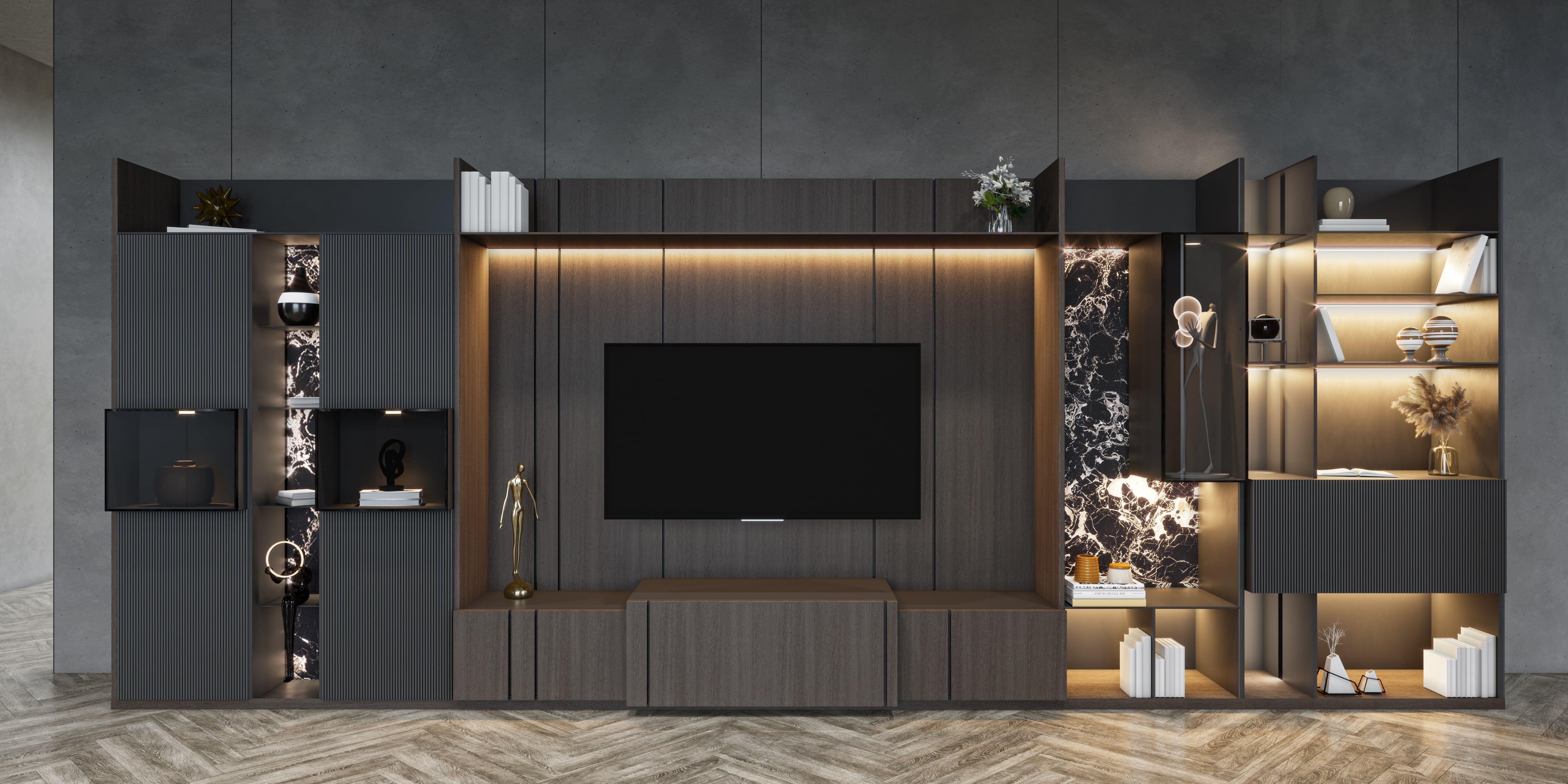 Mermer görünümlü arka paneller ile dikey aydınlatmalar bir araya getirilerek raf alanları derinleştirilmiştir. Geniş yatay modül, medya birimleri için yeterli saklama alanı sunarken, dikey bloklar dekoratif objeler ve kitaplar için düzenli bölmeler oluşturur.