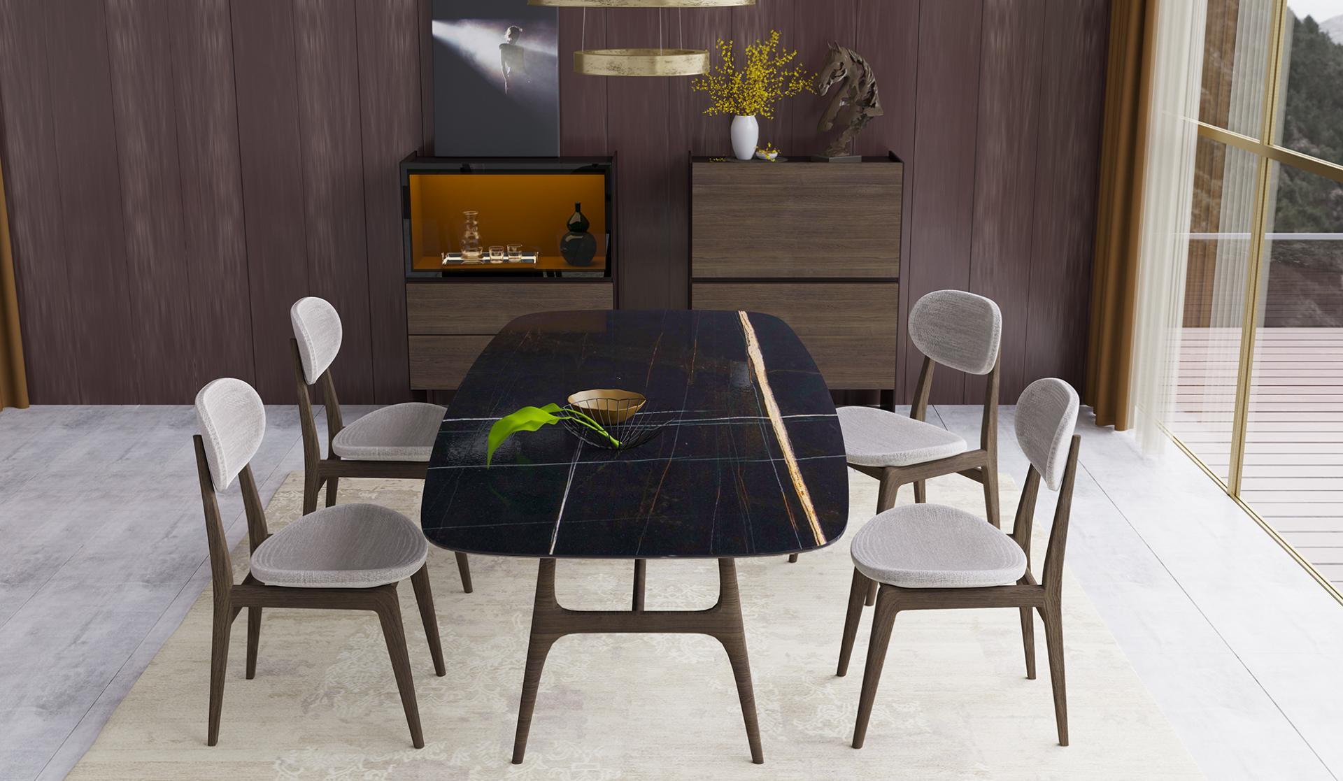Zıtlıkların uyumunu kusursuz bir tasarımla buluşturan Galata Elit Yemek Odası, modern çizgiler ve klasik dokunuşlarla evinize zarafet katıyor. Kübik ve oval formların dengeli birlikteliği, yemek odanıza dinamik bir hava getirirken, her detayı özenle düşünülmüş tasarımıyla dikkat çekiyor.