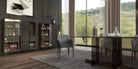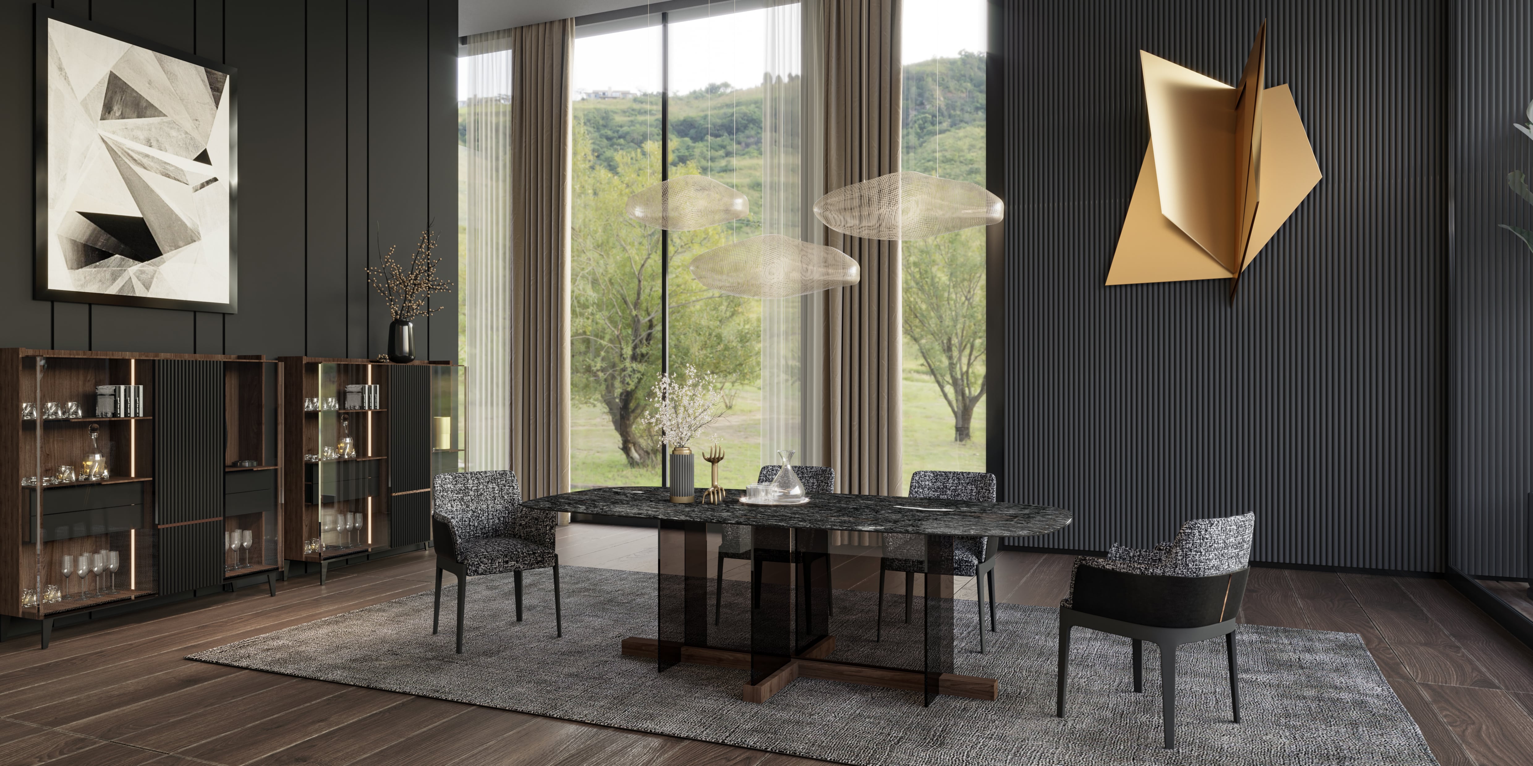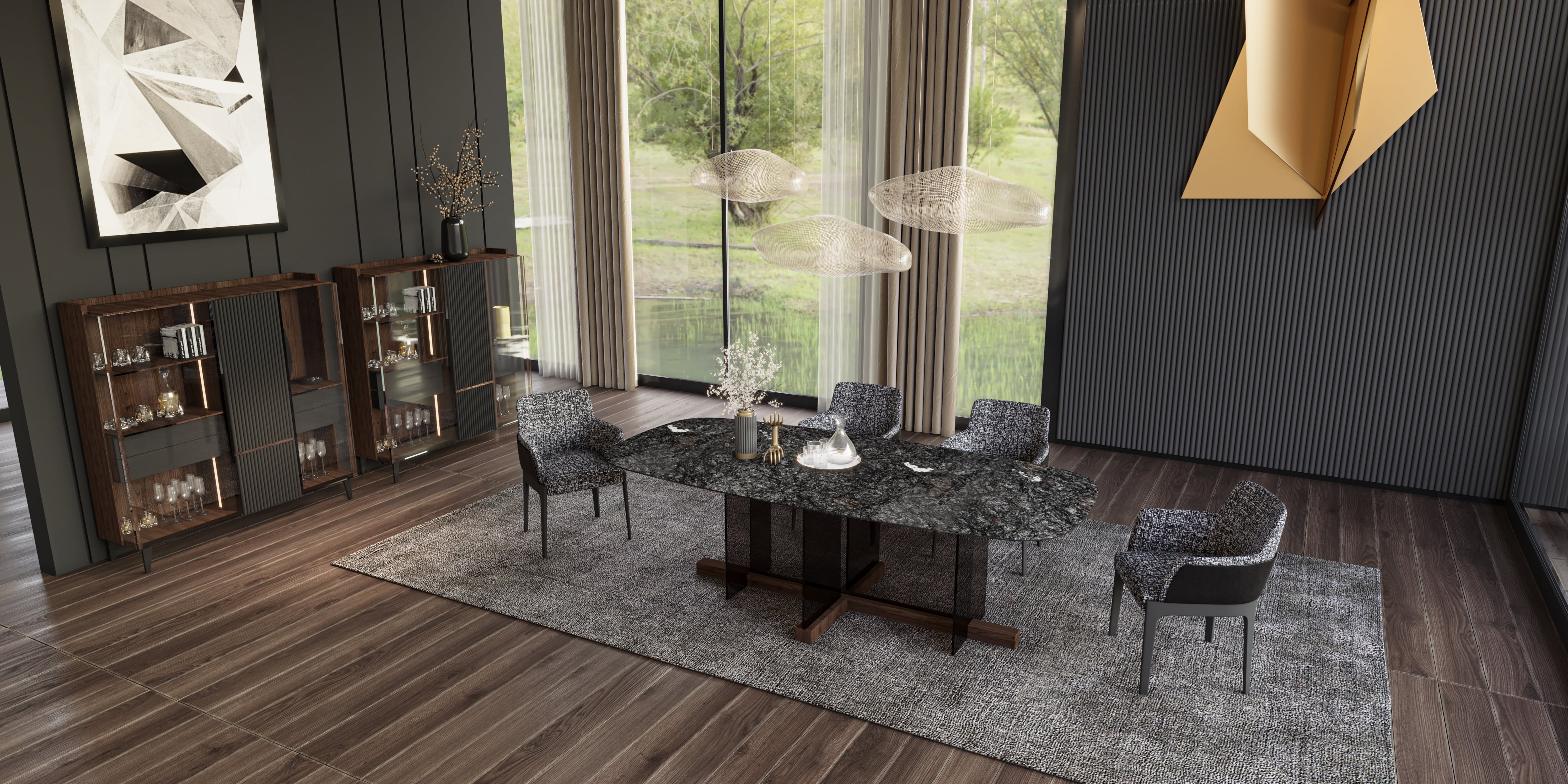 Yemek takımına eşlik eden vitrin modülleri, ceviz kaplama ve antrasit detaylarla birleşerek hem saklama hem de sergileme işlevini üstlenir. Cam kapaklı raf sistemi, kristal bardaklardan dekoratif objelere kadar her detayın kendini göstermesine imkân tanır.