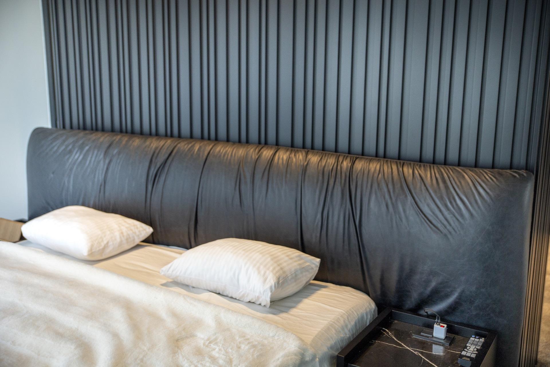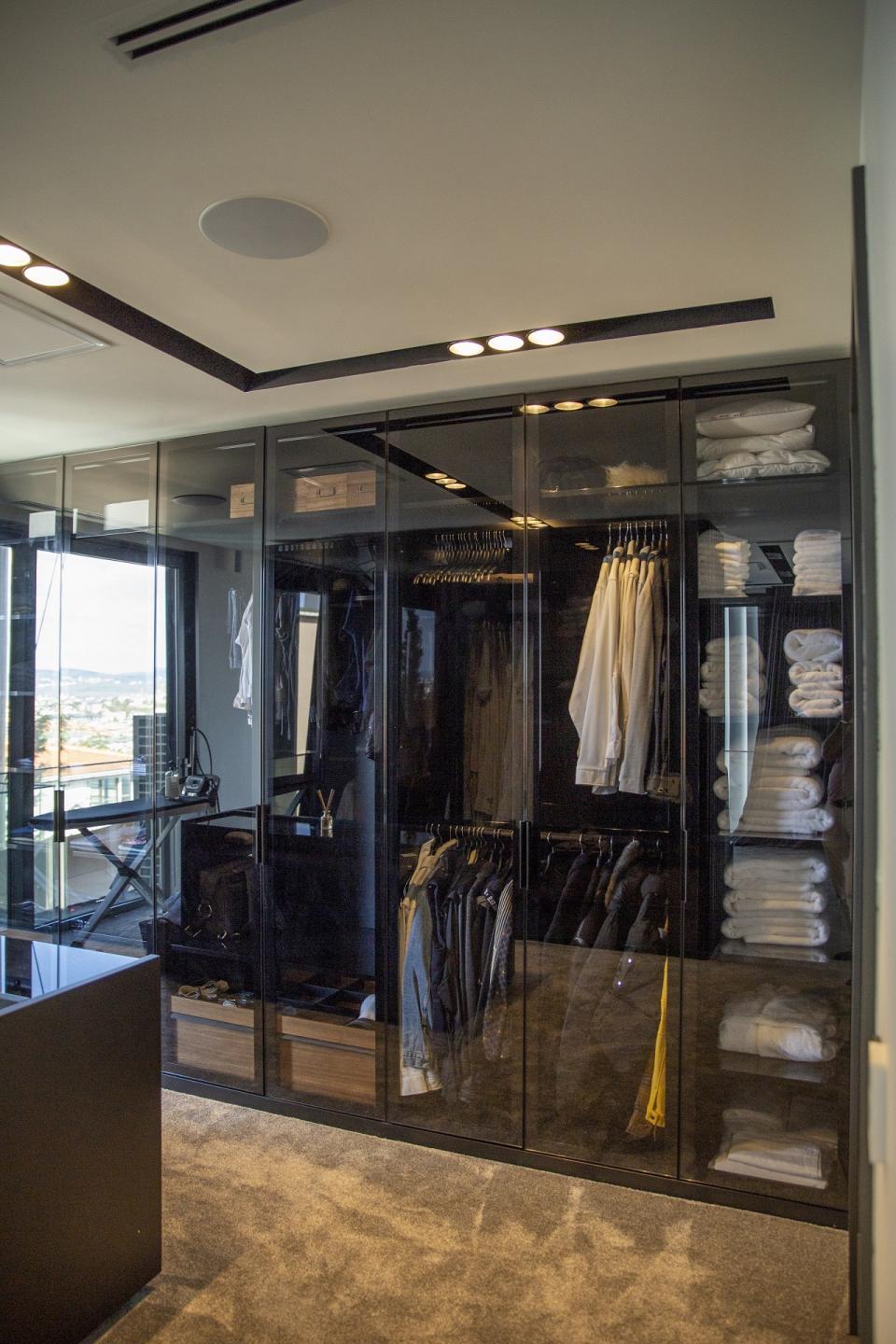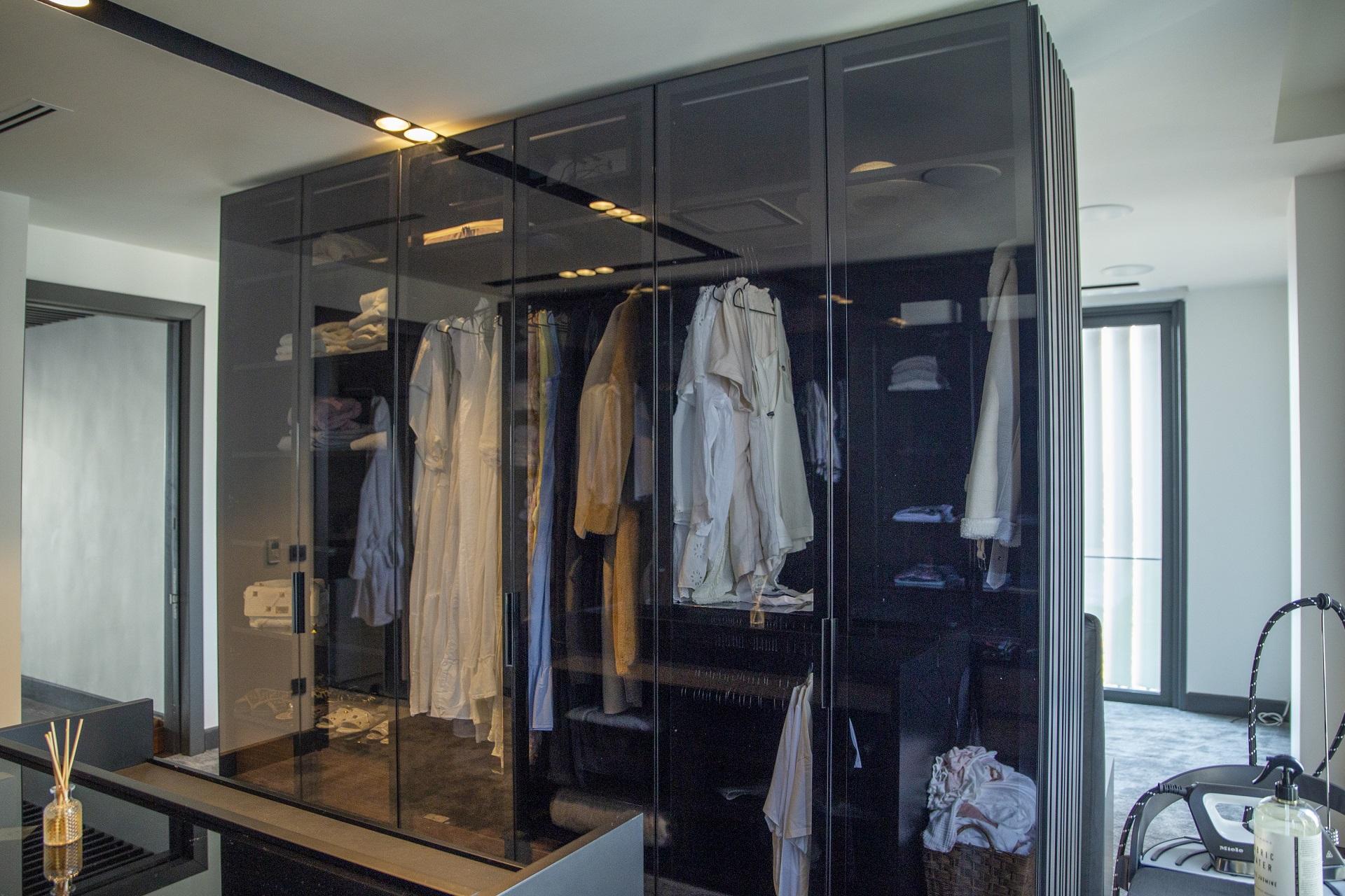 An elegant color palette dominated by dark gray and black tones was preferred for the project. The use of glass surfaces allowed the area to be perceived as wider and more spacious with natural light, while the harmony between matte textures and glossy surfaces created a stylish atmosphere. The custom-designed glass-fronted dressing room combined functionality and aesthetics, while the leather headboard and marble-detailed nightstands used in the bedroom section achieved a high-end elegance.