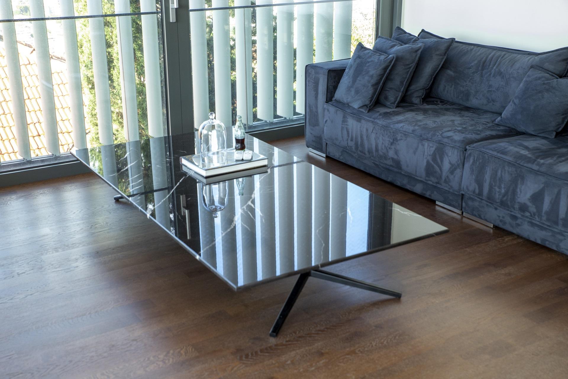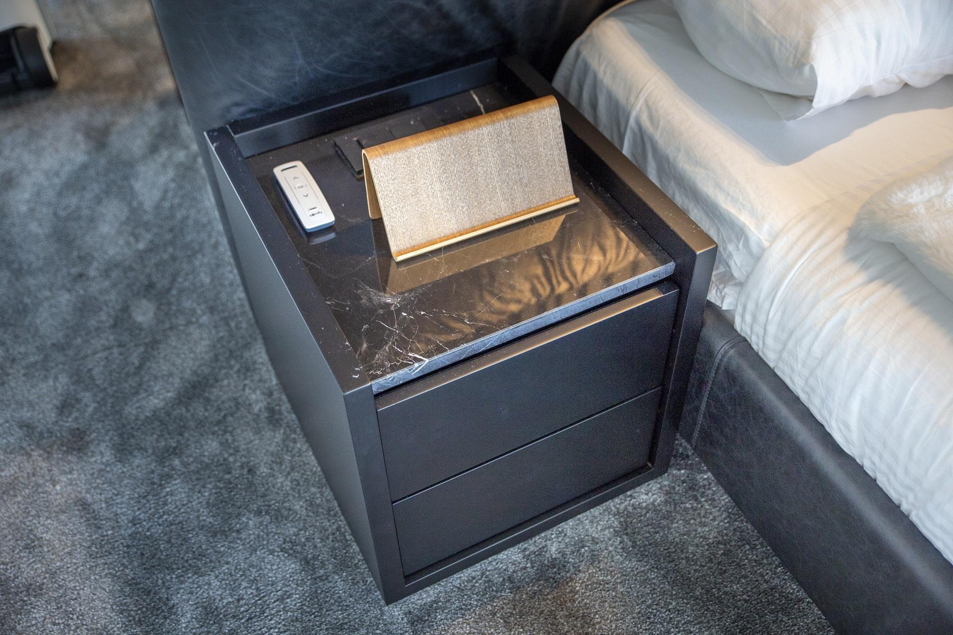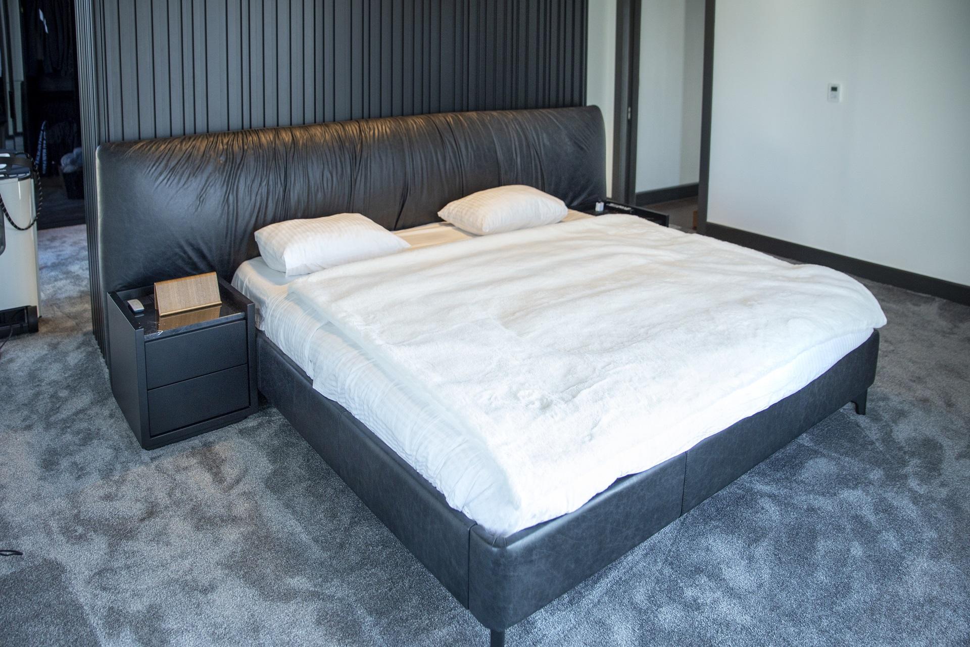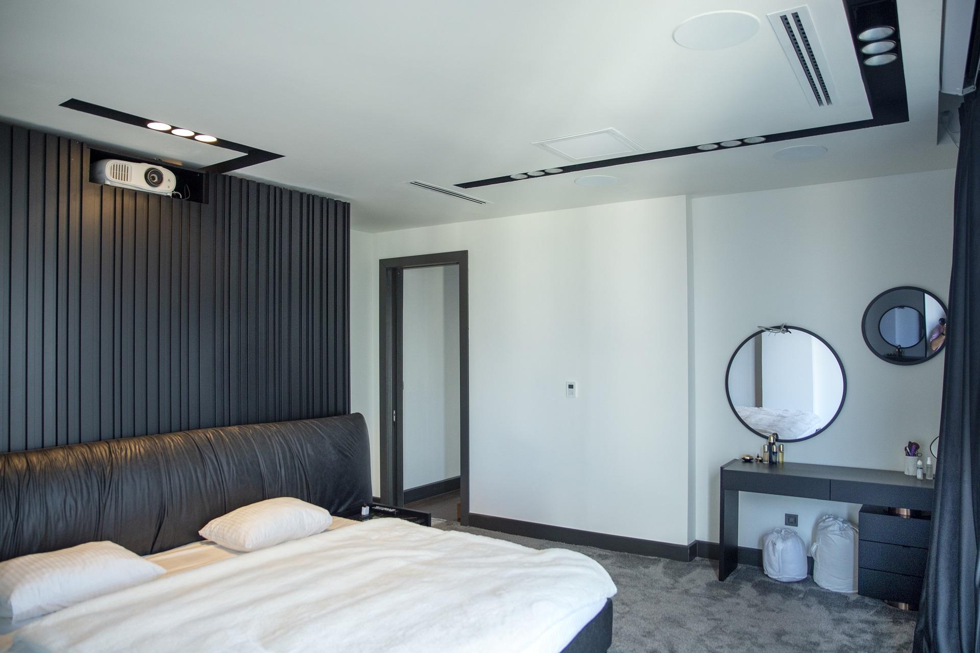An elegant color palette dominated by dark gray and black tones was preferred for the project. The use of glass surfaces allowed the area to be perceived as wider and more spacious with natural light, while the harmony between matte textures and glossy surfaces created a stylish atmosphere. The custom-designed glass-fronted dressing room combined functionality and aesthetics, while the leather headboard and marble-detailed nightstands used in the bedroom section achieved a high-end elegance.