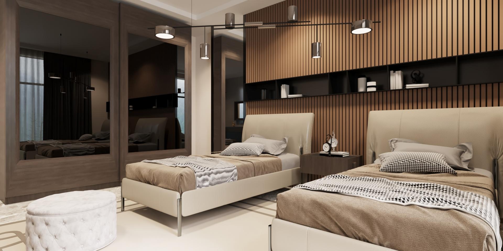 The specially designed desk, cabinets with ample storage space, and modern bed design made efficient use of every area of the room.