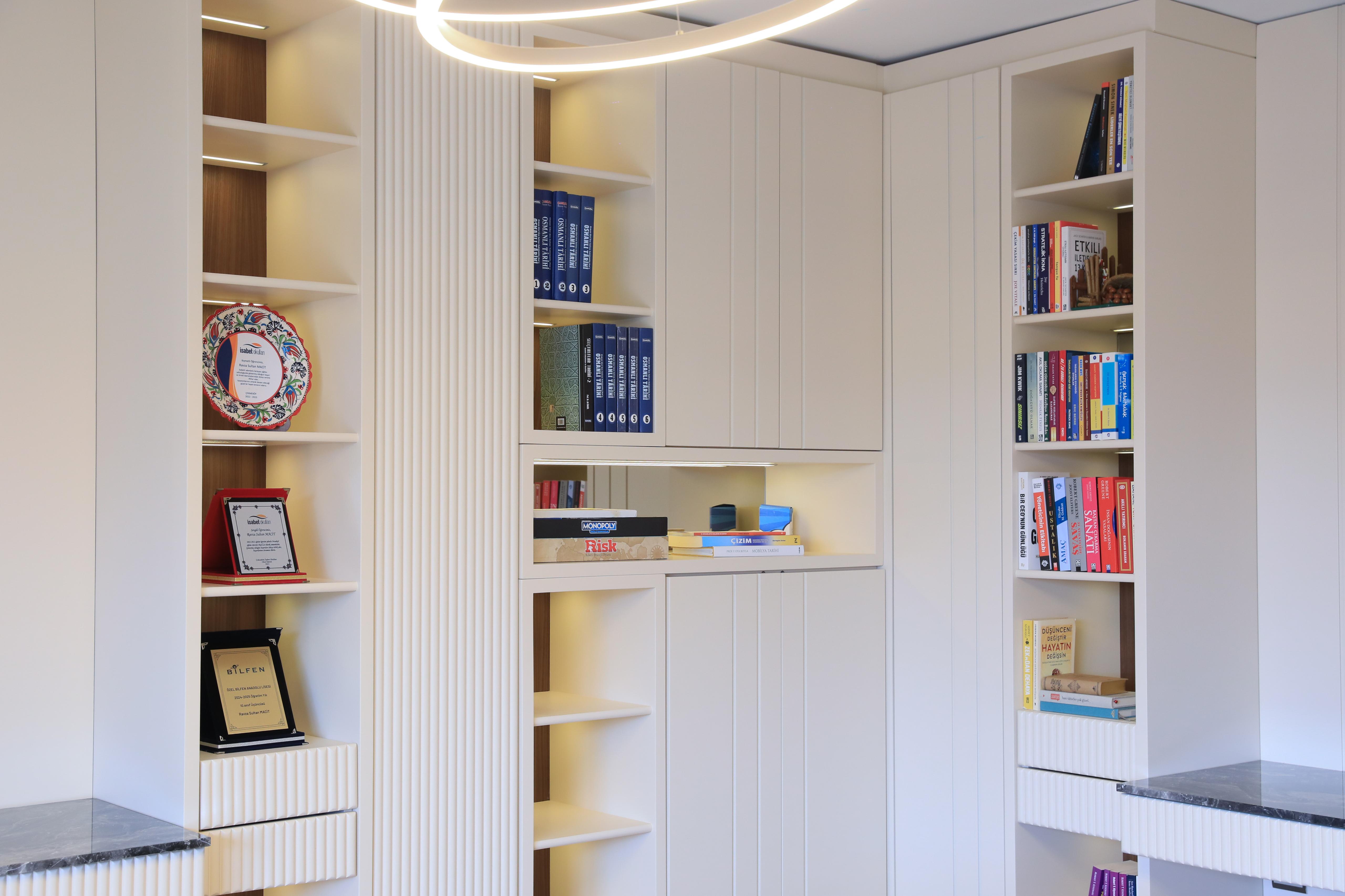 Another noteworthy element in the project is the specially designed bookshelf systems. These units, which offer both display and storage space with combinations of open shelves and closed cabinets, are enhanced with LED lights that highlight books and objects. The marble-surfaced desk and modular storage solutions integrated into the workspace allow for multifunctional use of living areas.
