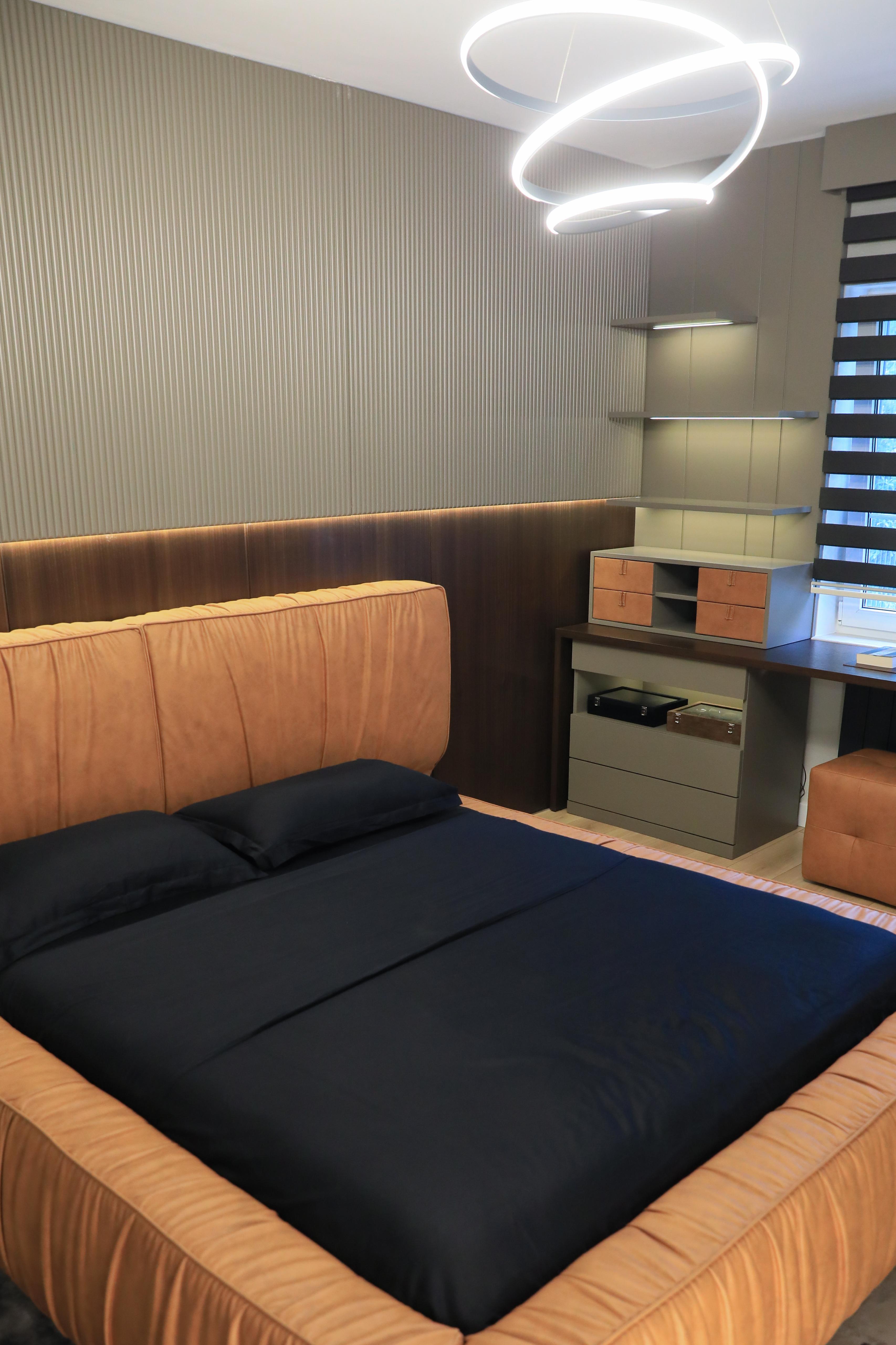 The leather quilted headboard and matte surface combinations used in the bedroom bring together modern elegance with a warm atmosphere. The design, completed with a desk and modular units, offers practical details to meet the needs of daily life. Overall, the furniture preferred in the project stands out with natural stone details, functional storage areas, minimal lines, and soft textured fabrics, promising a timeless elegance that can be used for many years.