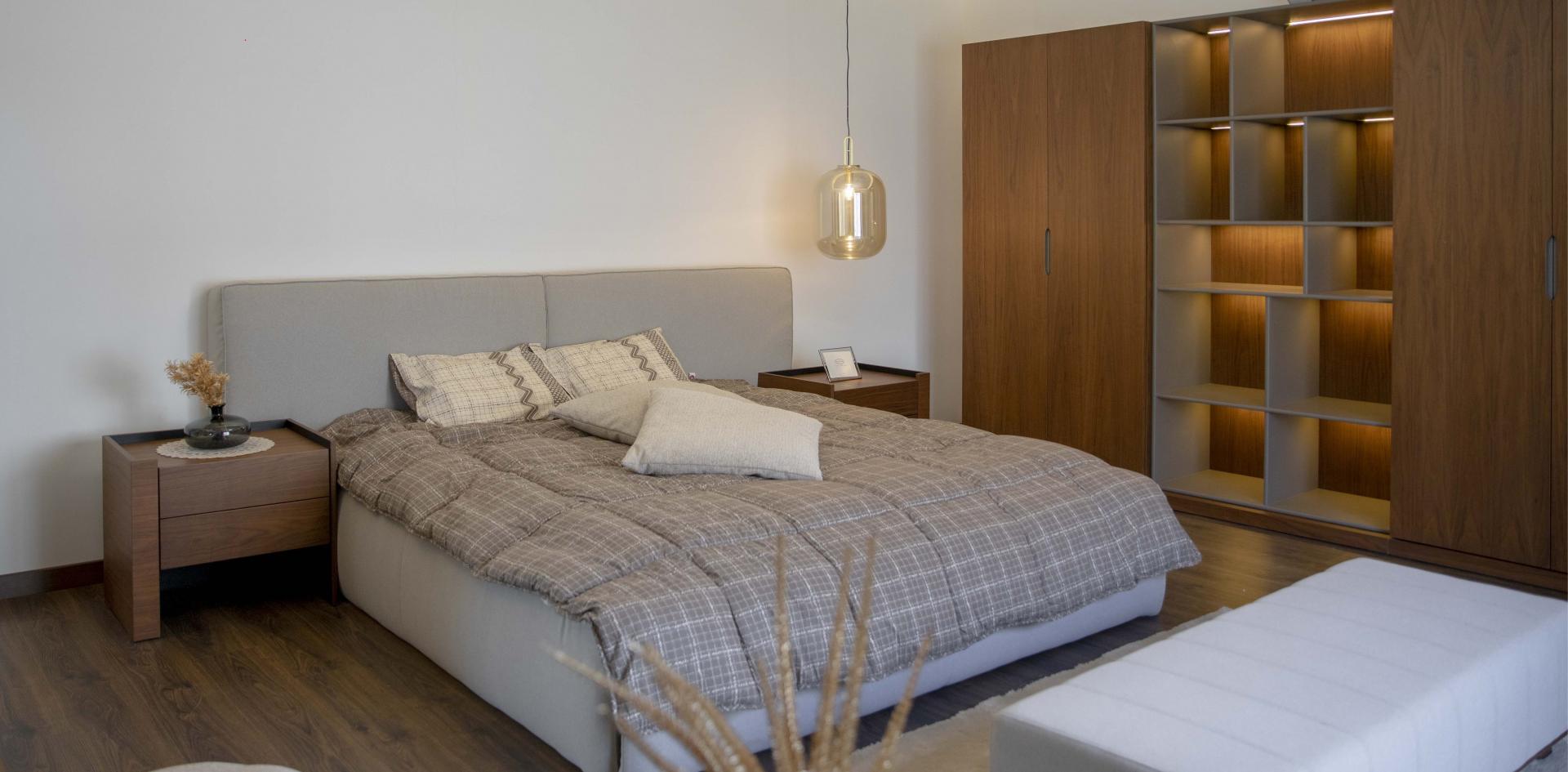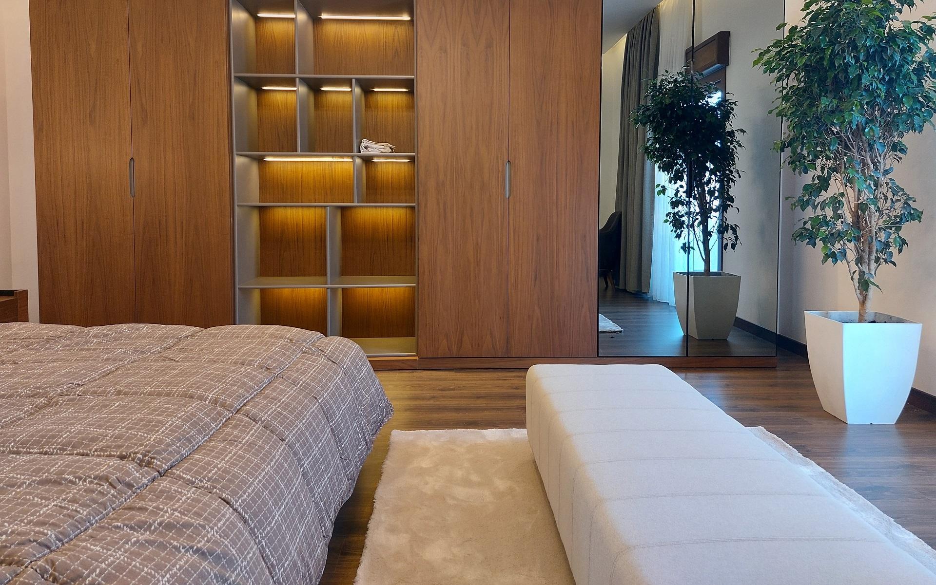 In the bedroom decoration, where white and gray tones are preferred, walnut wood details add warmth to the space, providing a modern look. With a practical wardrobe design, both aesthetics and comfort were highlighted.