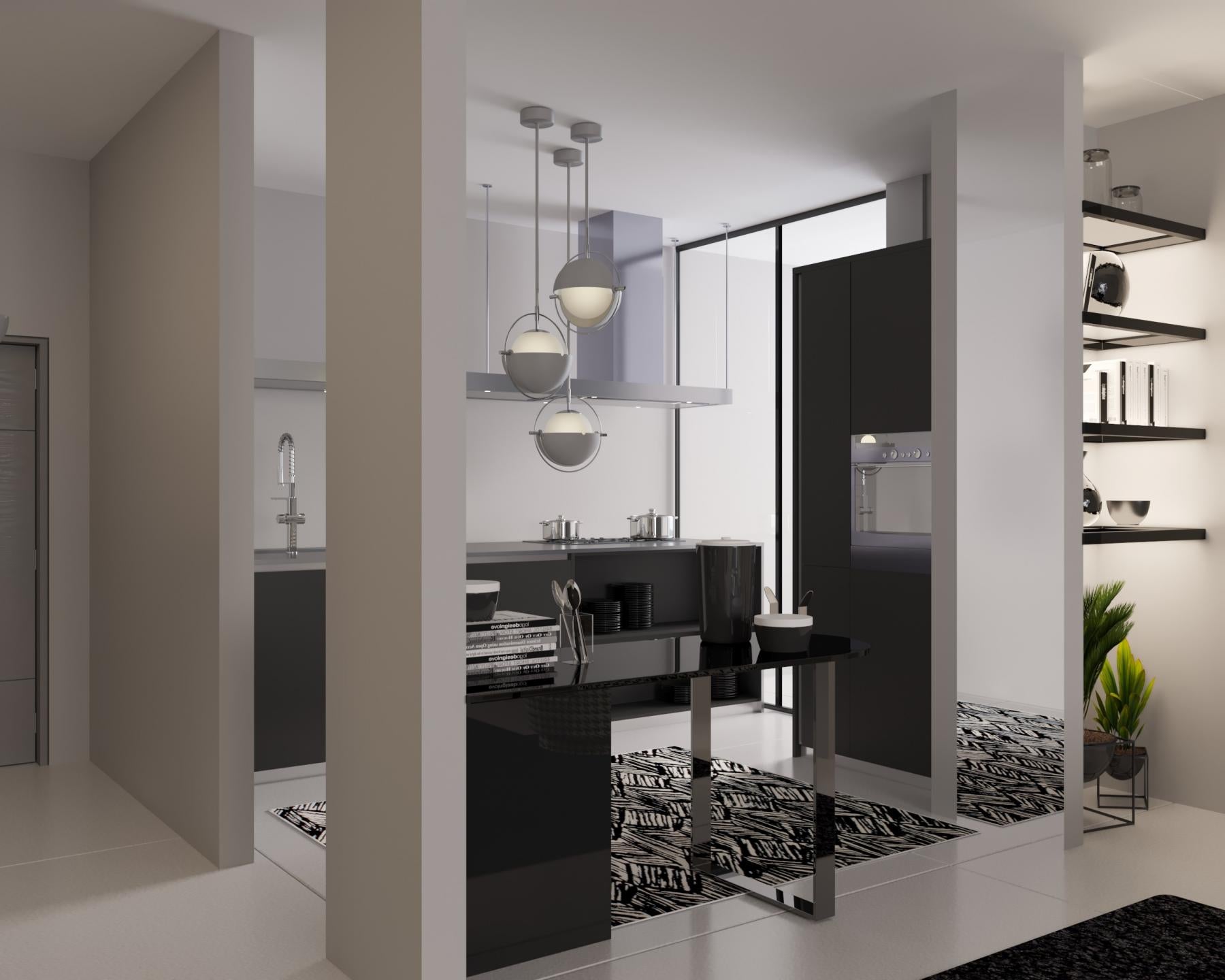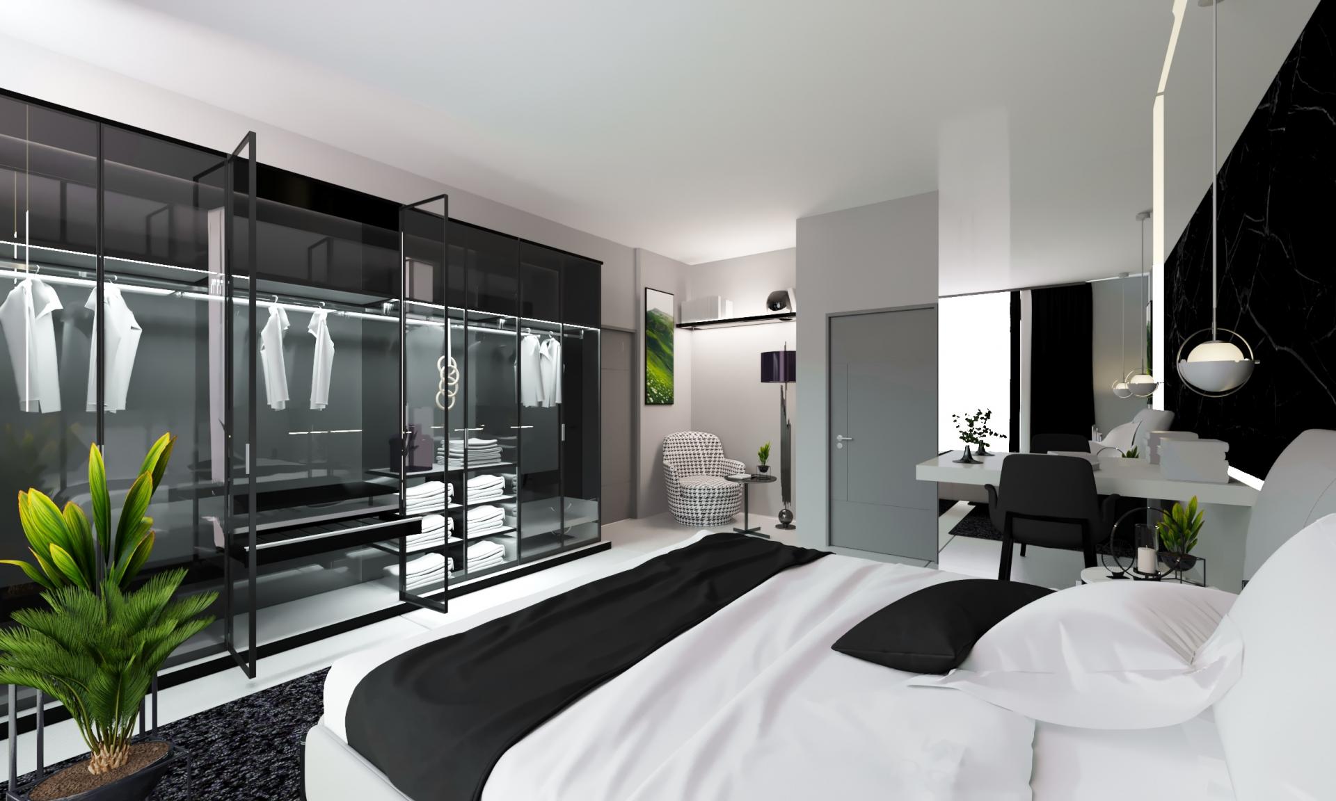 This modern home decoration, shaped by contemporary design understanding, combines the strong contrast of black and white with elegant details. The functional use of space is supported by the integrity of an open-plan kitchen and living room, while large glass surfaces bring natural light into the interior to the maximum level. The selection of furniture dominated by minimalist lines offers both comfort and aesthetics. The atmosphere enriched with modern artworks, stylish lighting, and plant details creates a dynamic and sophisticated living space at home.