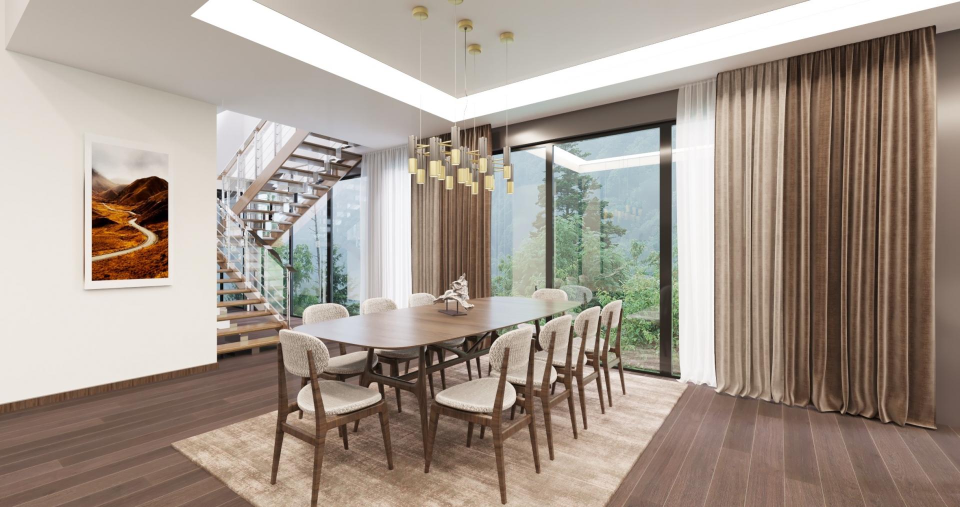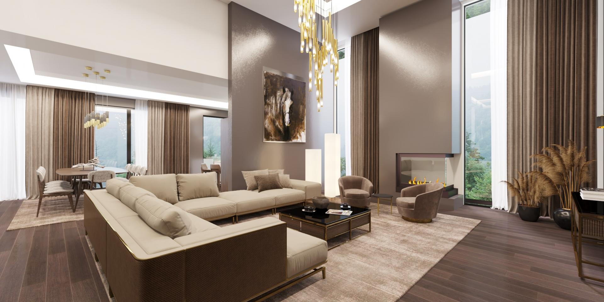 In this design where modern lines meet a warm atmosphere, light-colored sofas and natural wood textures stand out. High ceilings combine with wide glass facades to offer a spacious living area. Gold detailed lighting and elegant artworks complete the elegance of the living room. In our Libya project, we reinterpreted the understanding of timeless elegance.