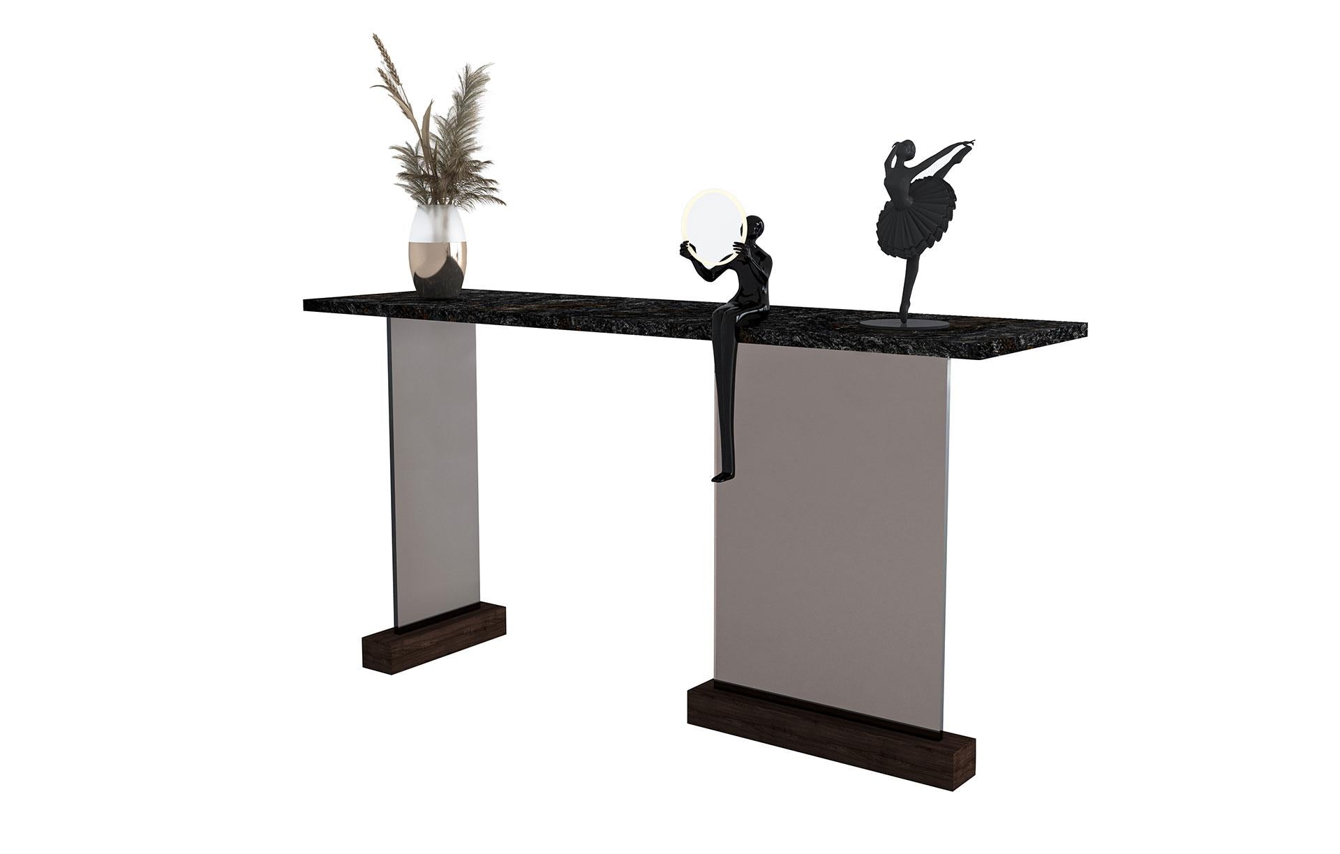 The Yason Console Table adds an elegant touch to living spaces with its minimalist and modern design. Its black marble patterned top surface is eye-catching with its elegance, while its metal legs offer a solid and aesthetic appearance. This coffee table, which is both a functional and decorative piece, creates a striking accent in any room. It offers a practical use thanks to its easy-to-clean surface.