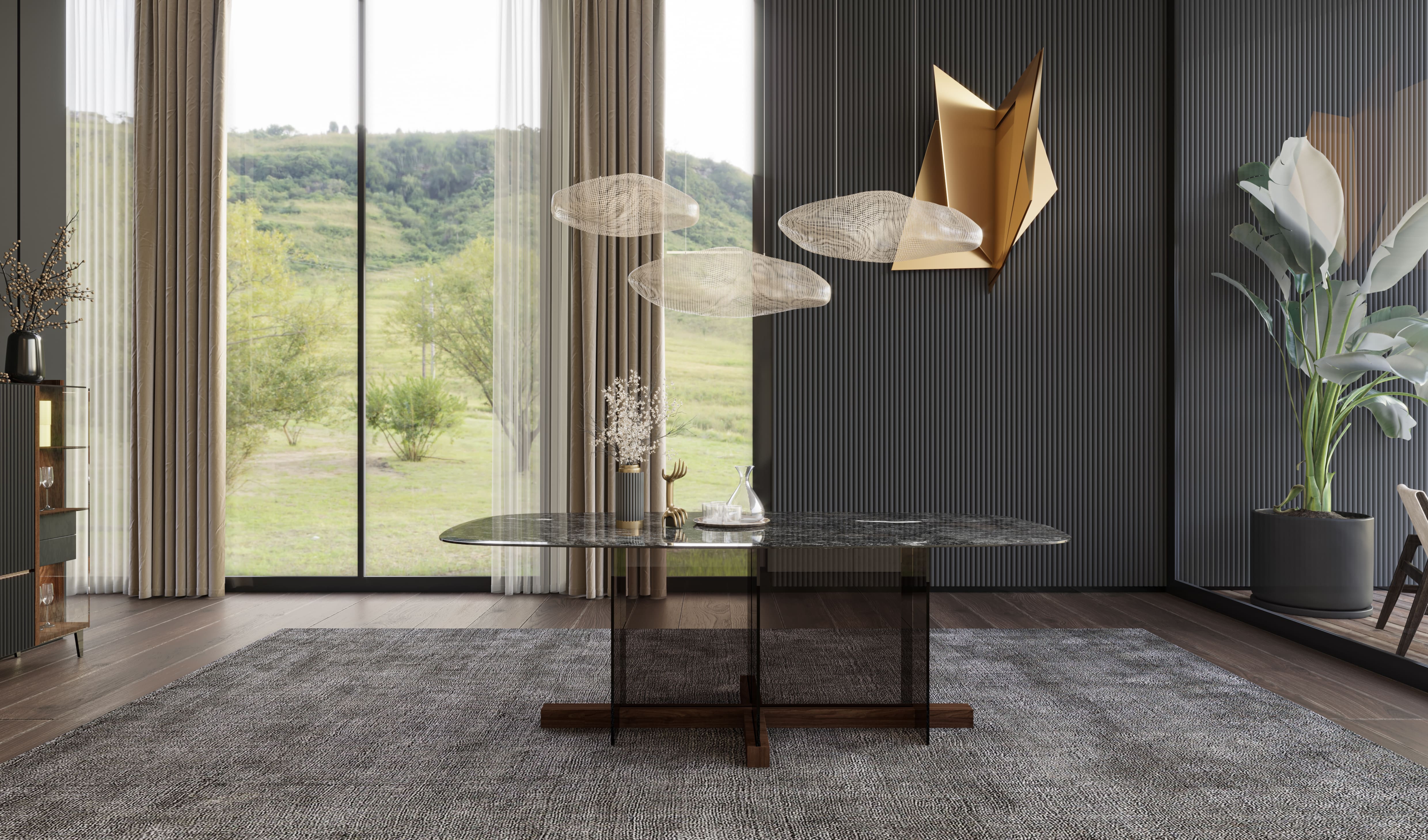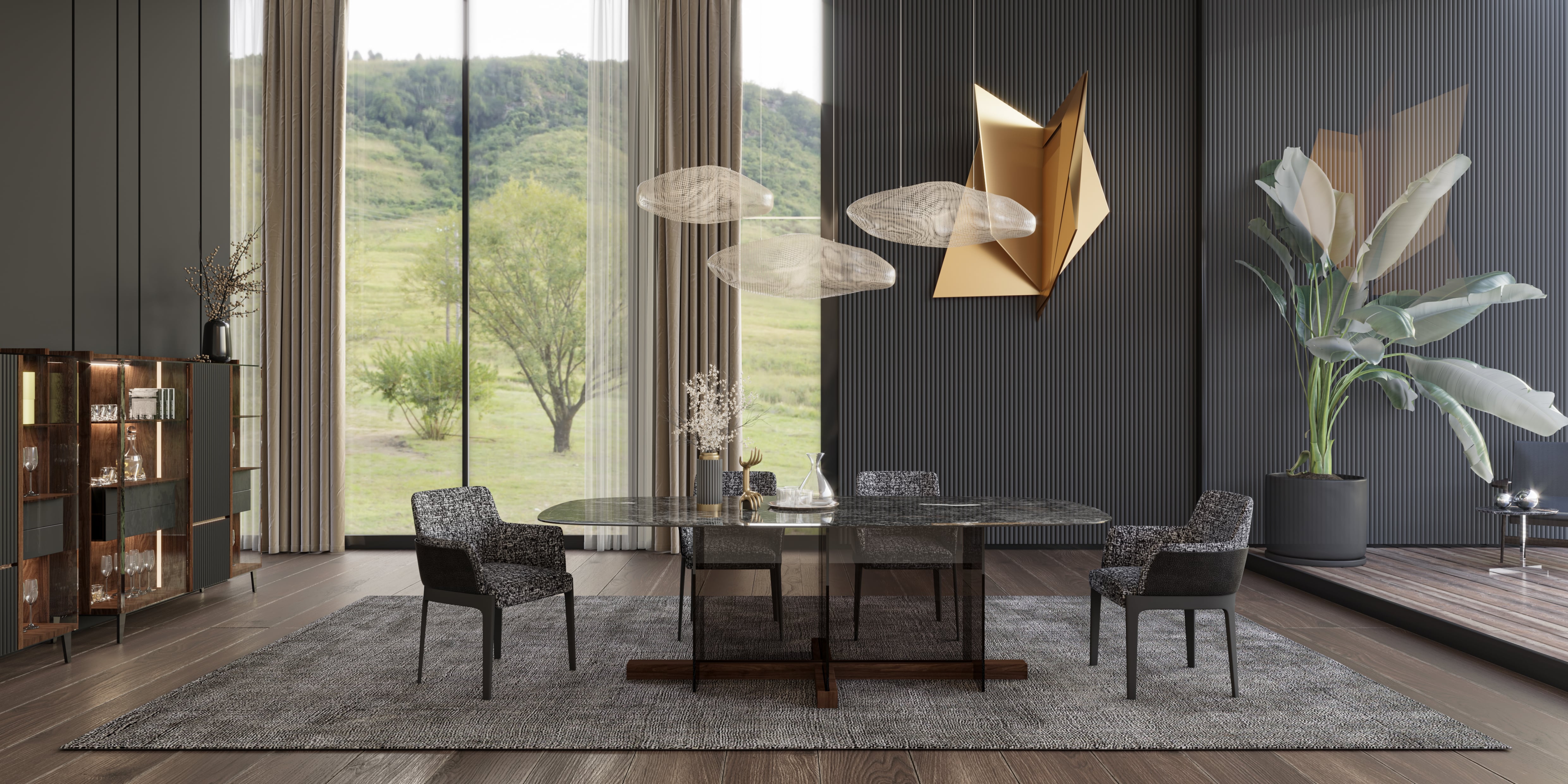 Yason Yemek Takımı, doğayla uyumlu renk paleti ve çağdaş form diliyle yemek alanlarında estetik bir bütünlük yaratır. Takımın merkezinde yer alan oval formlu masa, doğal taş dokulu cam yüzeyiyle hem görsel zenginlik sunar hem de kullanım kolaylığı sağlar. Yason’un zarif masası, minimal siyah cam ayakları ve ceviz detaylı taban yapısıyla mekâna derinlik katar.