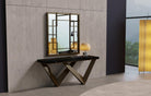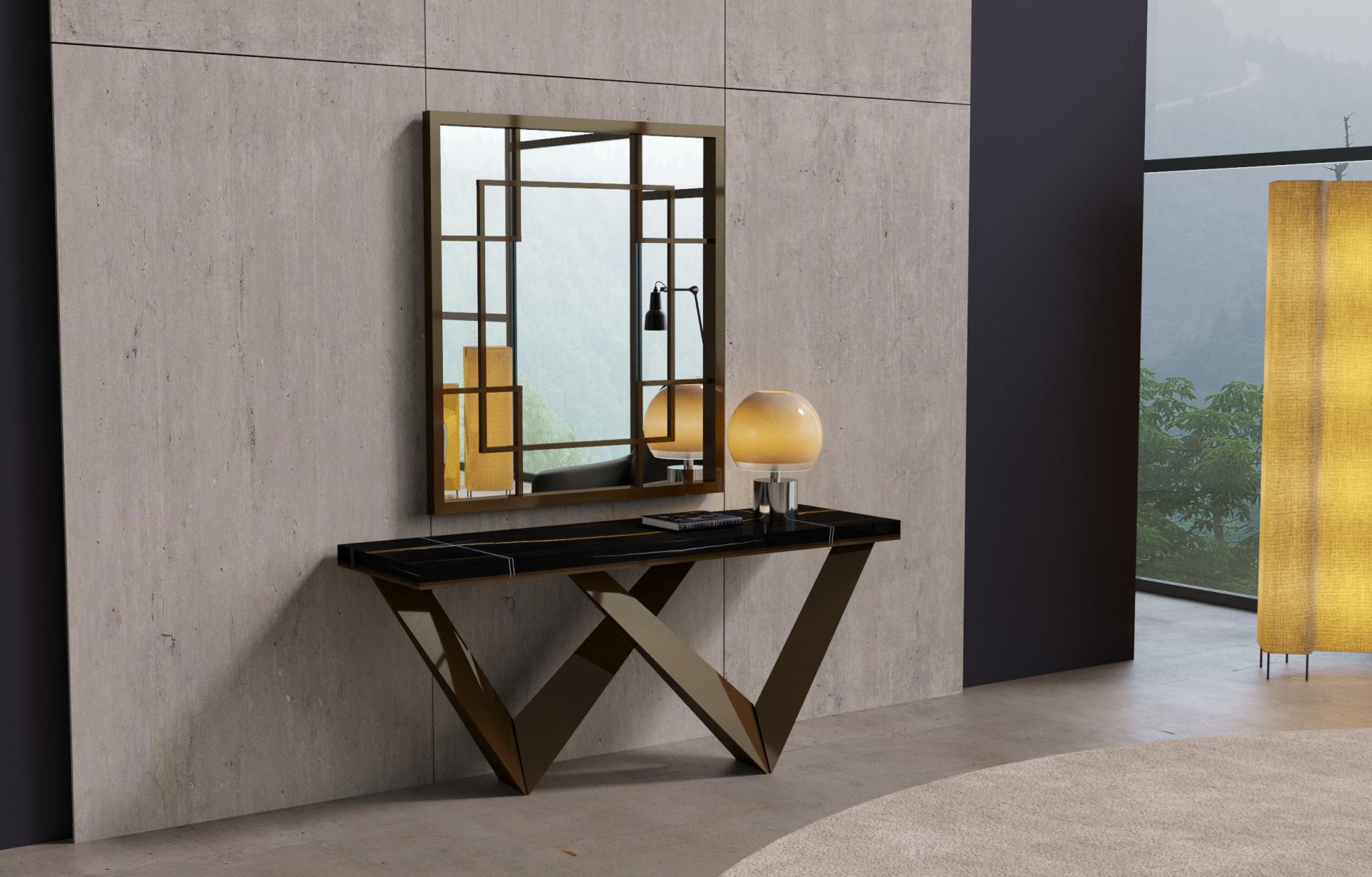 Zevye Konsol Sehpa, modern tasarımı ve şık yapısıyla her tür iç mekânda zarif bir atmosfer yaratır. Üst kısmında kullanılan kaliteli siyah mermer yüzey, zarif detaylarla birleşerek sofistike bir görünüm sunar. Konsolun alt kısmındaki geometrik kesimler, hem görsel hem de yapısal olarak dikkat çekerken, dayanıklı malzemelerle uzun süreli kullanım sağlar. Aynalı tasarım, mekâna derinlik katarak şıklığınıza şıklık katar.